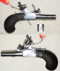 kleines Steinschloss Terzerol um 1830/40, abschraubbarer Lauf, Lauflänge 3,8 cm, Gesamtlänge 15 cm, Kaliber 10,4 mm, auf dem Kasten beidseitig Gravur eines fliehenden Rehbocks., alter belgischer Beschuss (ELG ohne Umrandung) von Lüttich, gute Funktion, Alters- und Gebrauchsspuren
