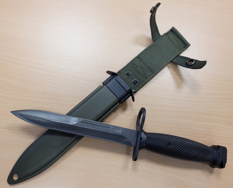 US M7 Bajonett mit Scheide aus Eickhorn-Fertigung, Baujahr unbekannt. Gesamtlänge 30cm, Klingenlänge 17cm, Klingenstärke 5mm, Klingenbreite 22mm, Gewicht 280g, Material: bruchelastischer Federstahl mit einer Härte von 53 HRC, Griff aus schwarzem Kunststoff, Scheide mit Gürtelschlaufe, Material: grüner Kunststoff, Mundblech aus Stahlblech, Nieten mit „Eickhorn“-Schriftzug versehen (siehe Fotos). Das Bajonett ist absolut neuwertig, Klinge ist geschliffen, die Lieferung erfolgt im originalen Karton, Lieferumfang: Bajonett, Scheide, Karton. Zustand: neuwertig, siehe Bilder. Spuren auf der Klinge stammen von der Haltefeder der Scheide und entstehen beim Herausziehen. Bajonett ist kompatibel mit AR-15 (M16, M4, …), Steyr AUG, Galil, FN FNC, Beretta AR70/90 und alles an Waffen, welche über die Standard NATO-Bajonettaufnahme verfügen. Versand als versichertes DHL-Paket. Da Privatverkauf keine Garantie / kein Umtausch. Bitte Altersnachweis beachten (frei ab 18).