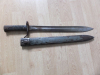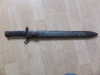 Rare baïonnette à croisière double pour le fusil 1898 ou 1888. Traces d’oxydation de surface à nettoyer, lame propre avec poinçon sur le dos de la lame. Bouton poussoir fonctionnel. Les plaquettes ne sont pas d’origines mais semblent assez anciennes. Le fourreau est incomplet à son extrémité. ABC 771, Roy Williams 326 p452.