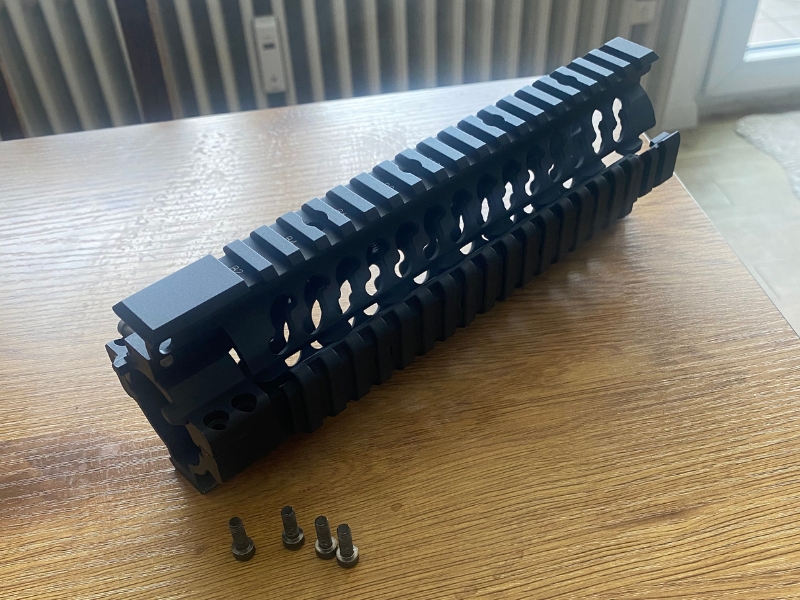 Zweiteiliges Free-Float Rail-System für AR-15 - montierbar ohne Entfernen von Gas- oder Laufkomponenten. Inklusive Befestigungsschrauben. Made in USA.