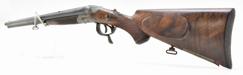 Stahlsystemkasten mit Tiergravur, Rückstecher im vorderen Abzug. Signalstifte zur " gespannt " Anzeige auf dem Kolbenhals, Schaftmagazin für 4 Kugelpatronen, partielle Rostnarben. Geöffnet wird die Waffe mit einem Hebel unter dem Abzugsbügel. Verschluss ohne Spiel, leicht matter Kugellauf, die Schrotläufe sind blank. Schaftlänge 35cm gemessen vom vorderen Abzug bis Mitte Schaftkappe.