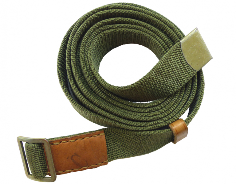 Sowjetischer (UdSSR) Gewehrriemen für leichtes Maschinengewehr DP 28. Olivfarbenes Webleinen mit Rechteckschließe, Lederschieber und Metallzwinge am Gurtende.