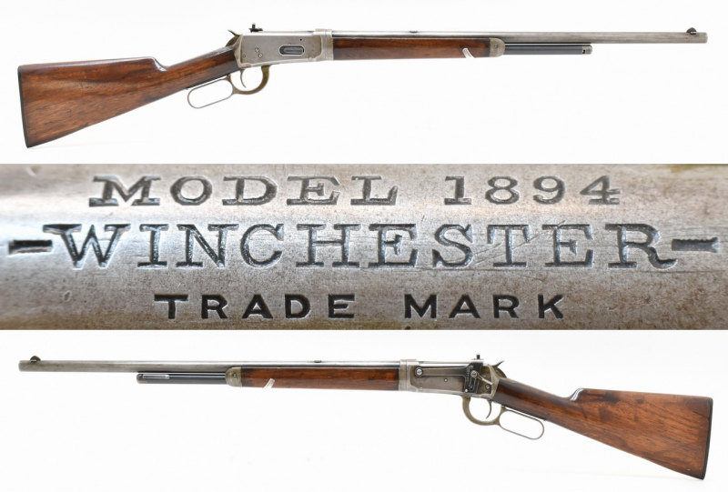 " Lever - Action " Rifle Modell 1894 aus Produktion der - Winchester Repeating Arms Co., New Haven, Connecticut - in der ohne Werkzeug zerlegbaren Take - Down Ausführung. Hergestellt im Jahre 1906. Blanker 24" Originallauf mit runder Laufkontur. Entfernte Kimme. Systemkasten mit zeitgenössischer LYMAN Receiver Sight / Lochkimme. 330mm langer Schaft für Rechts- und Linksschützen; im Bereich der Schaftnase alte Ausbesserung / Reparaturstelle ( Schaftlänge gemessen vom Abzug bis Mitte Schaftkappe ). Metallteile mit beriebener und stellenweise patinierter Oberfläche. Details siehe Bilder.