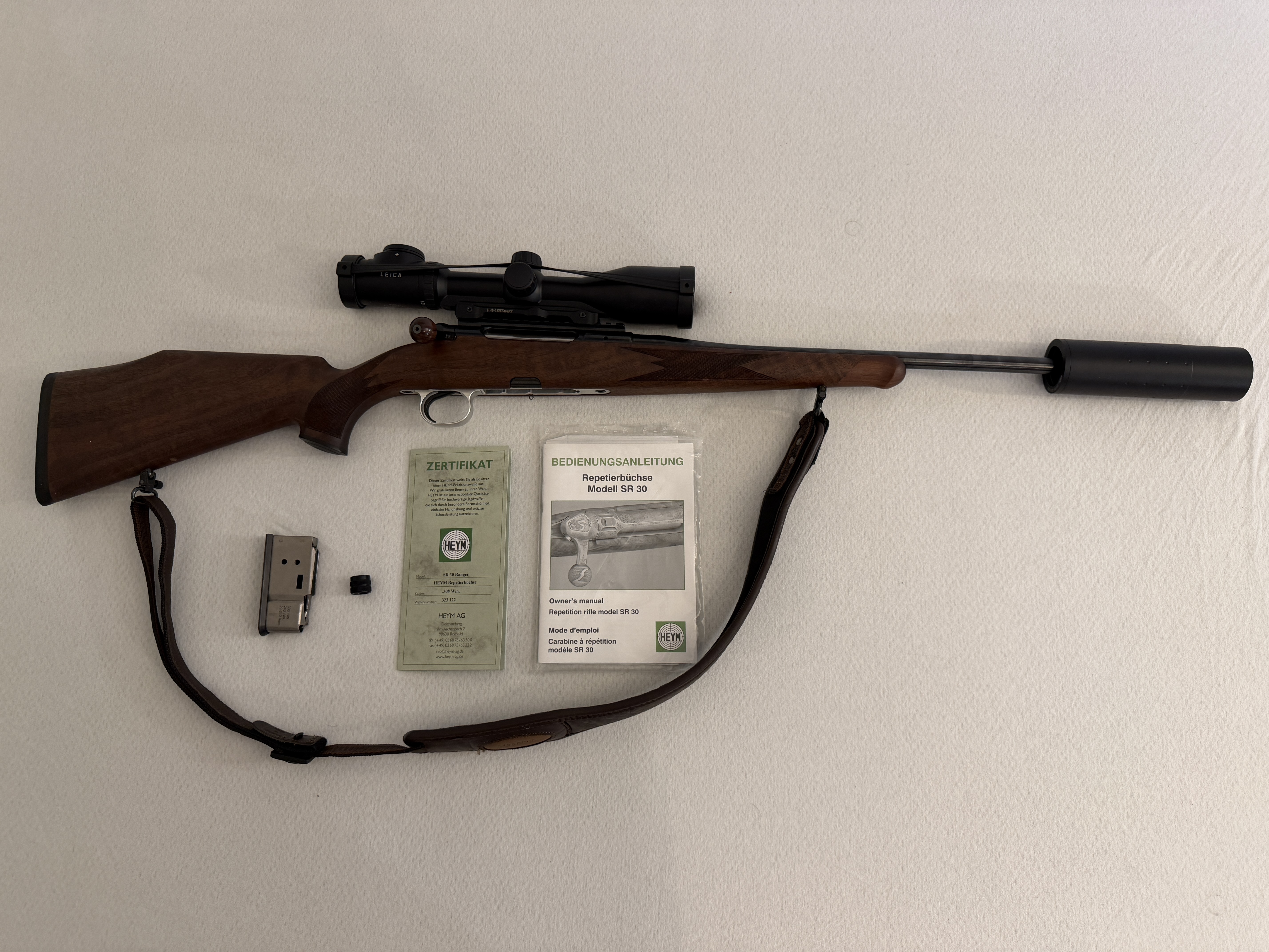 Verkaufen eine Heym SR 30 Ranger im sehr guten Zustand. Auch verkauft wird der abgebildete Schalldämpfer von Stille im Wald. Kaliber .308 Win. Lauflänge 50cm. Kapazität 3+1.