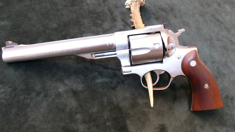 Ruger Mod. Redhawk Revolver, Kal. .44Mag. (6-schüssig), Erhaltungszustand sehr gut (fast keine Ausbrennspuren in der Rahmenbrücke, vereinzelt kleine Macken und stumpfe Stellen auf der Oberfläche). Lauf (Lauflänge 18,9cm) selbstverständlich blank. Die Waffe verfügt über eine verstellbare Visierung. Der Abzug steht "staubtrocken". Die Oberfläche ist poliert.