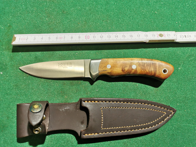 Messer mit feststehender, durchgängiger Klinge, Metallbacken sind aufgesetzt, Lederscheide, Joker, 440 Stahl, Spain, unbenutzt