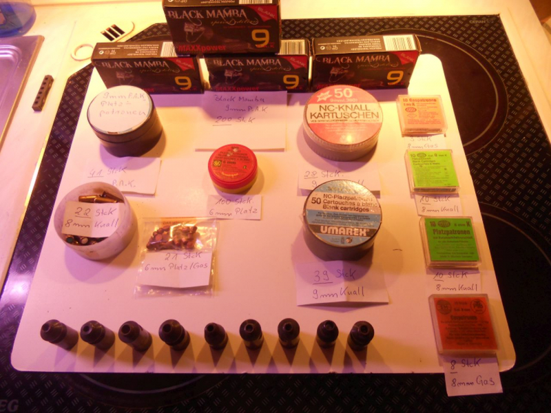 Nun zum Artikel : Aus Nachlass ein Konvolut aus verschiedenen Platz/ Schreckschussmunition der Kaliber 6mm , 8mm , 9mm und 9mm P.A.K. Teilweise alte Munition mit höherem Gasdruck, auch einige etwas angelaufen.