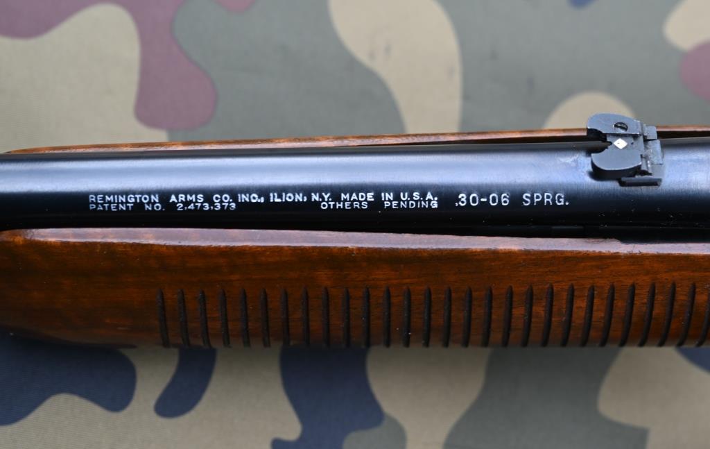 Herstellerschriftzug "Remington", Modellbezeichnung "760 Gamemaster" , Seriennummer, mehrere Beschusszeichen, Kaliberangabe ".30-06 SPRG.", Gefahr- und Patenthinweise.