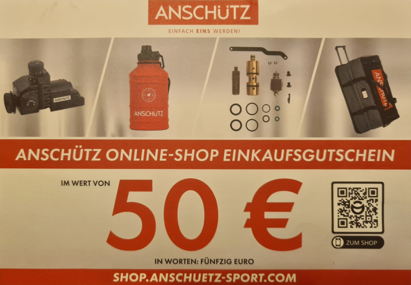 Keine Kombination mit anderen Aktionen möglich. Gültig nur im ANSCHÜTZ Online Shop: shop.anschuetz-sport.com, einmalig einlösbar, nicht nachträglich anrechenbar. Mindestbestellwert: 100 €. Keine Barauszahlung. Gültig bis zum Ablauf der gesetzlichen Verjährungsfrist bis August 2026.