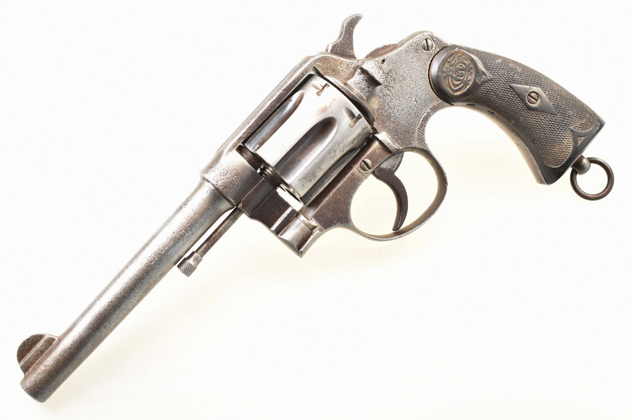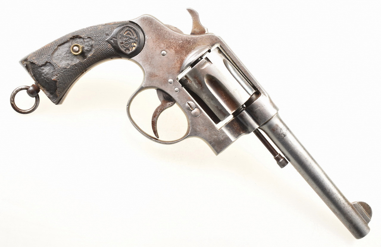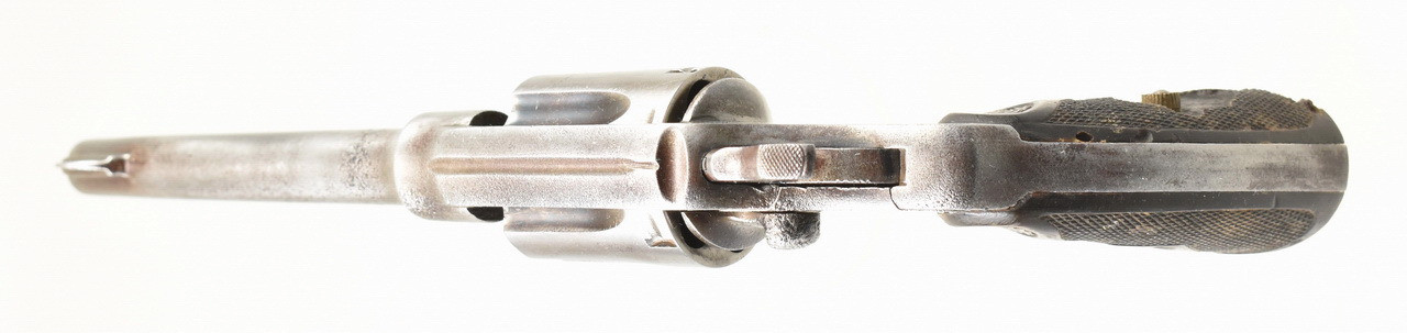 Spanische Kopie des Double Action Revolvers Colt Modell " Police Positive ". Hergestellt von Garate, Anitua y Cia., Eibar. In Spanien als Modell Oscilante bekannt. Blanker Lauf. Horngriffschalen mit Herstellerlogo und Fischhautmuster; die rechte Schale mit deutlichen Fehlstellen / Fraßspuren. Überholungsbedürftige Mechanik; Trommel wird nicht weitertransportiert. Metallteile mit stark beriebener und offenporiger Oberfläche. Details siehe Bilder.