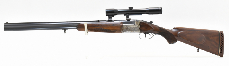 Stahlsystemkasten mit Tiergravur. Französischer Rückstecher im vorderen Abzug. Blanke Läufe aus Special Gewehrlaufstahl. Brünierung und Basküle partiell mit Rostnärbchen. Die Waffe ist auf einer SEM mit einem ZF Swarovski Habicht 4x32 Abs. 1 montiert. Dichter Verschluss, Beschuss von 01/65. Schaftlänge 38,5cm gemessen vom vorderen Abzug bis Mitte Schaftkappe.