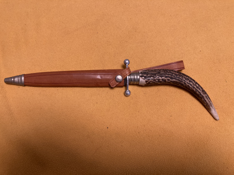 Hier versteigere / verkaufe ich einen exclusiven und sehr interessanten Dolch / Brieföffner der Schweizer Mengschliff Manufaktur aus DAVOS, in einer hellbraunen Lederscheide mit einer Hirschsprosse als Griff und einem Fingerschutz. Gesamtlänge: ca. 30 cm, Klingenlänge: ca. 15 cm, Griff: ca 14 cm. Es ist ein Liebhaber- Sammlerstück. Privatverkauf. DHL-Versand innerhalb Deutschland. Sollten Sie aus dem Ausland dieses wunderbare Einzelstück ersteigern, ändern sich die Transportkosten.