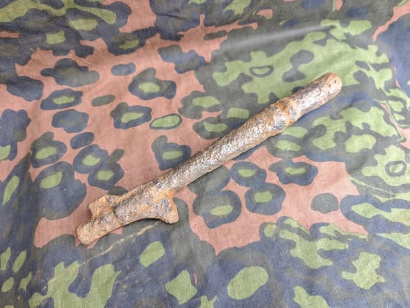 Originaler, stark korrodierter Lauf/Teil eines MP40-Maschinenpistolenlaufes, als Bodenfund geborgen. Deutliche Rost- und Materialverluste, nicht funktionsfähig, nur für Sammlungs- oder Ausstellungszwecke geeignet.