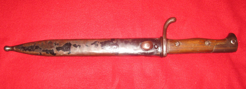 Sie bieten auf ein gekürztes, deutsches SG 98/05 mit Scheide ohne Feuerschutzblech, vermutlich Türkei M35, Hersteller: Waffenfabrik Mauser A.G., Oberndorf a.N. Zustand: siehe Fotos. Klingenrücken gestempelt mit Krone über W 17. Parierstück mit der Nummer 4612. Drücker ist gängig. Die gekürzte 98/05 Scheide hat einen aufgesetzten Tragehaken. Die gekürzte 98/05 Klinge wurde annähernd auf die gleiche Breite gebracht. Gesamtlänge mit Scheide: 405mm, Klingenlänge: 250mm, Gesamtlänge ohne Scheide: 380mm. Altersnachweis erforderlich. Versandkosten ins Ausland sind höher. Da Privatverkauf, keine Garantie, keine Rücknahme möglich.