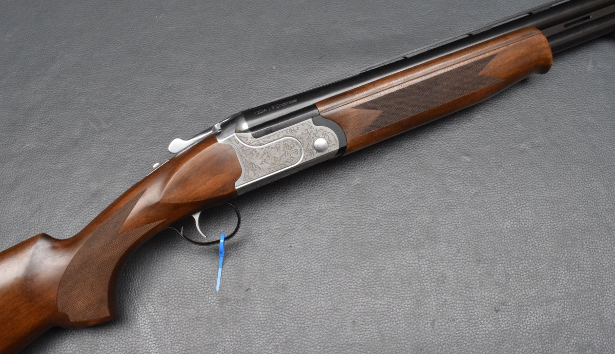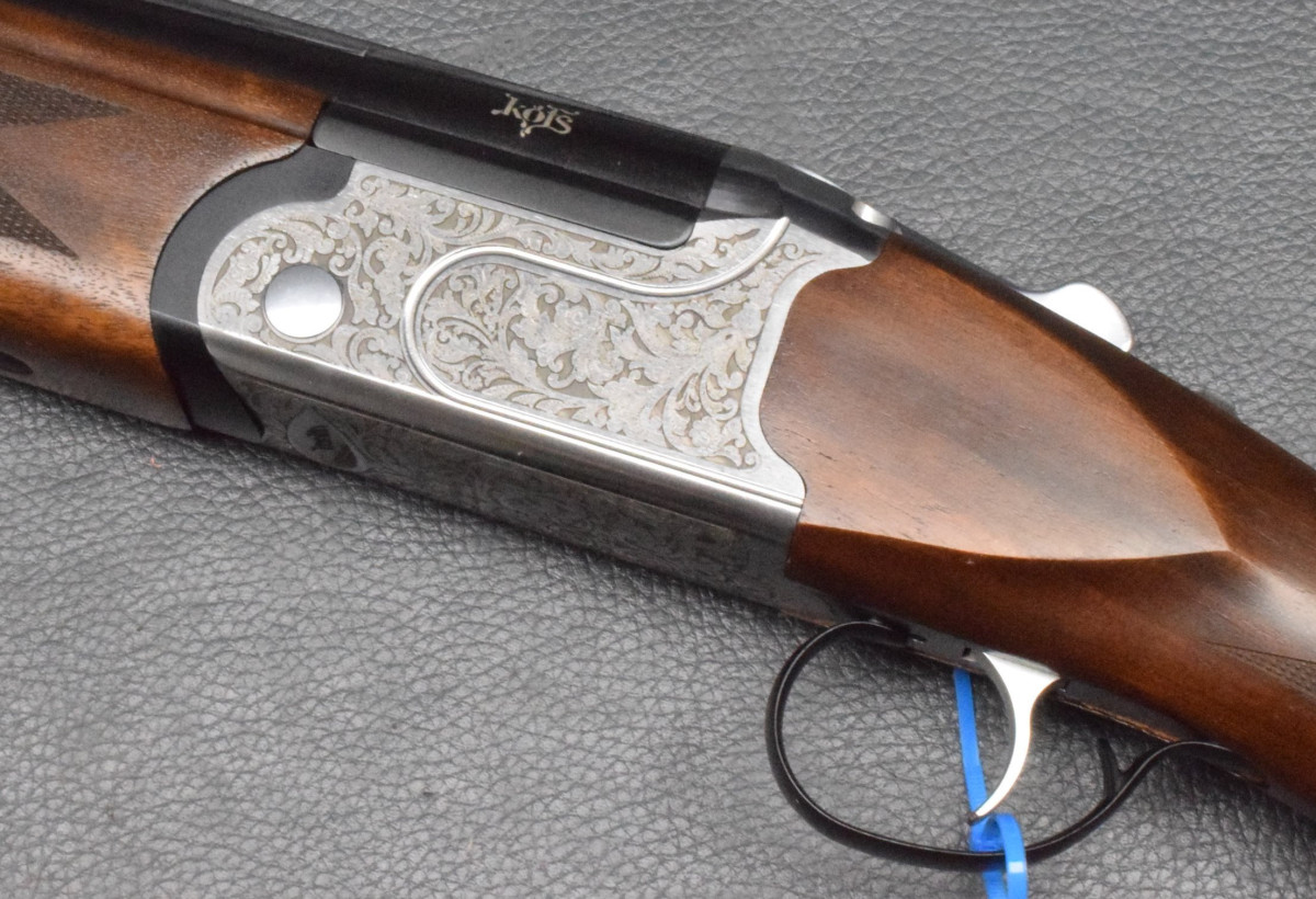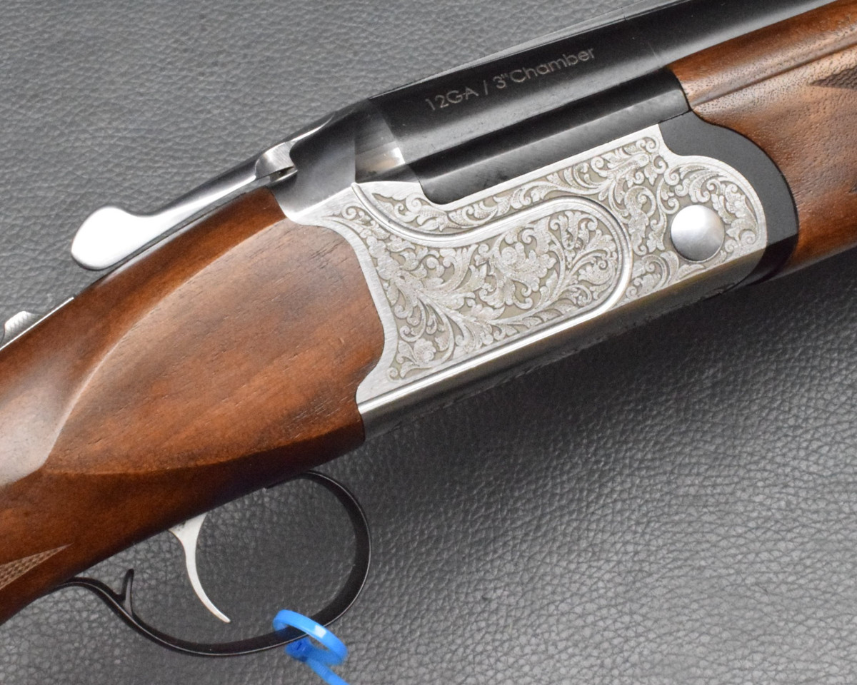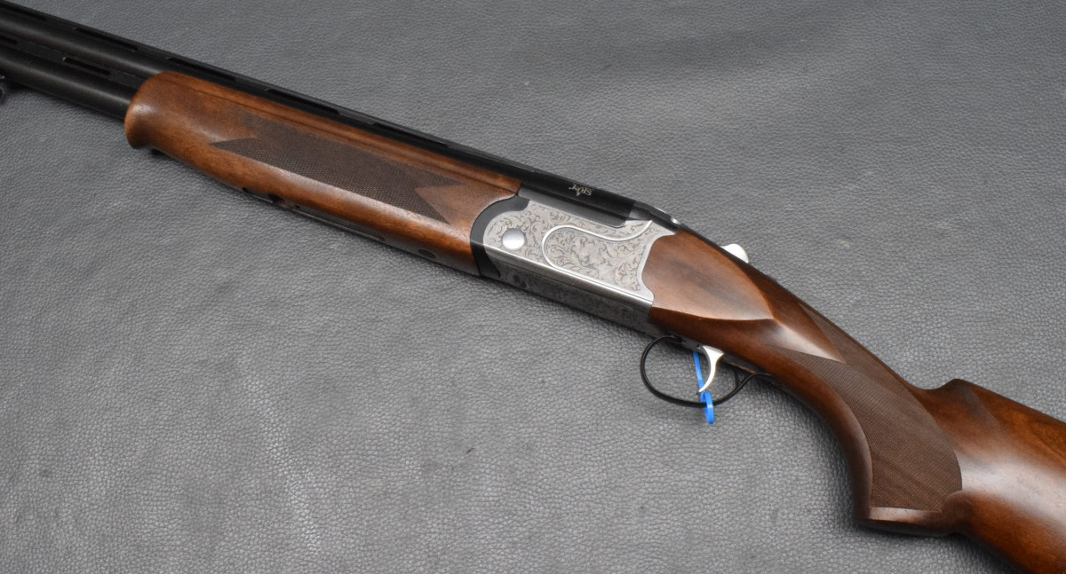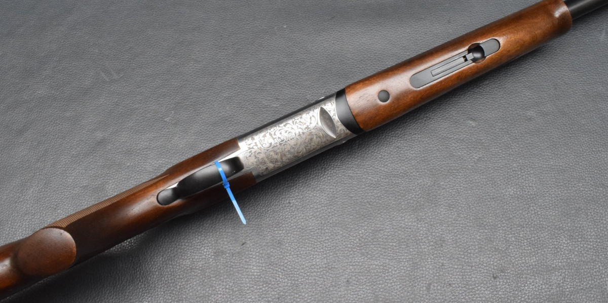 Sicherung/Umschalter auf dem Kolbenhals, Einabzug, ohne Ejektoren, Stahlschrotbeschuss. Nußbaumschaft ohne Backe, Gummischaftkappe & Riemenbügelbasen.
