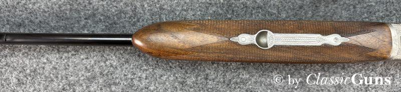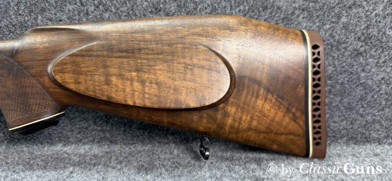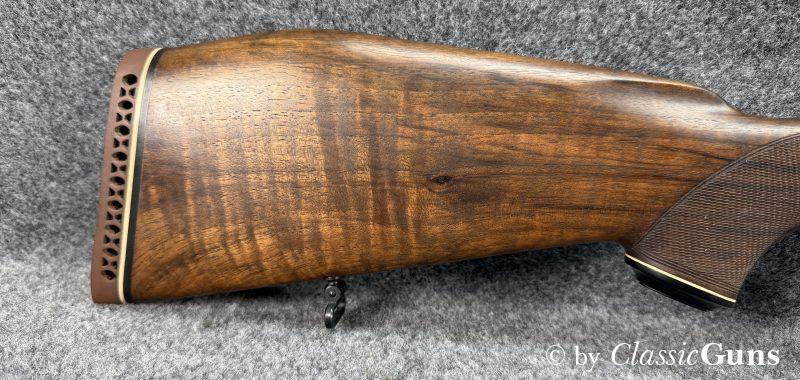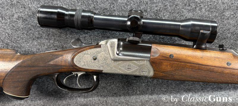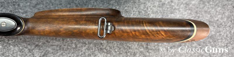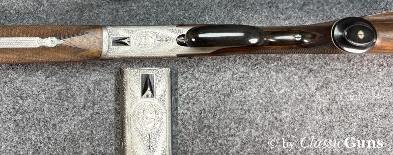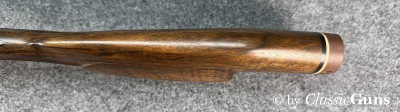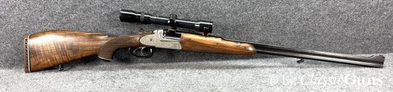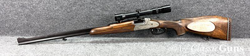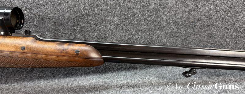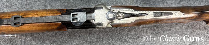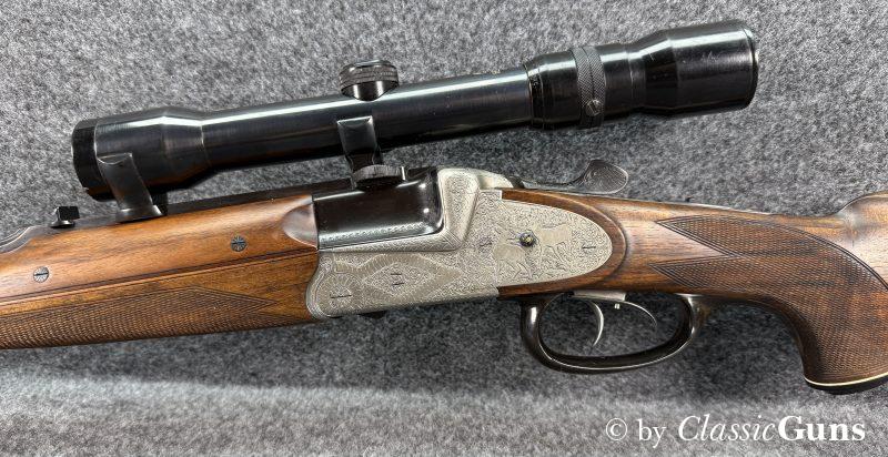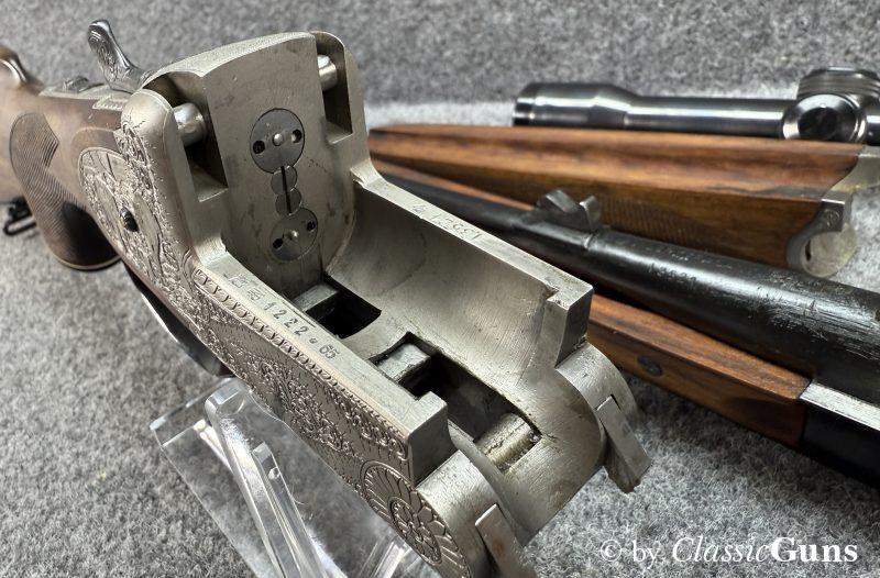 Reich gravierte und mit „Franz Sodia / Ferlach“ signierte Basküle, Laufbündel 650 mm lang und mit „W. Kunna, Koblenz“ (ehem. Jagdgeschäft in Koblenz) signiert. Beide Läufe mit neuwertigem Zug-/ Feldprofil und erstklassig erhaltener Brünierung. Der Lauf der kleinen Kugel wurde von .222 Remington auf die leistungsstärkere 5,6x50R Mag. aufgezogen (anschließend erfolgte der deutsche CIP-Beschuss). Schaft aus hochwertigem Nussbaum, mit nur minimalen Gebrauchsspuren. Beide Abzüge mit Rückstecher.