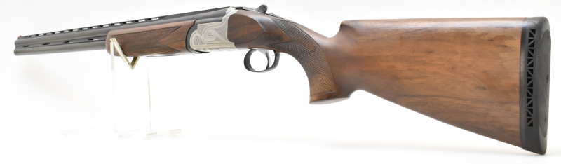 Flinte mit Einabzug und Ejektor ohne Umschaltung. Systemkasten mit Bukettgravur und Wurfscheiben. Spiegelblanke Läufe, strammer Verschluss. 10mm breite und ventilierte Laufschiene mit Hilfskorn, 37cm langer Sportschaft mit Gummikappe. ( Schaftlänge gemessen vom Abzug bis Mitte Gummischaftkappe ).
