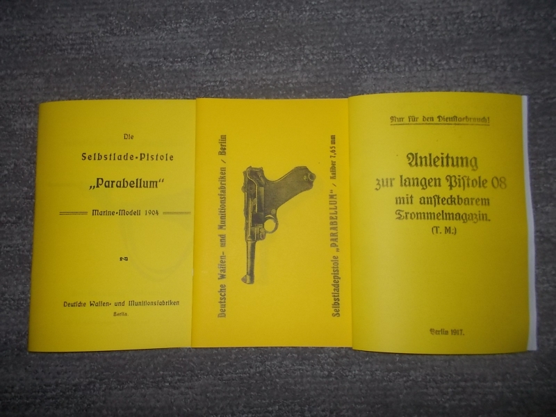 Verkaufe 3 Hefte DIN A5 Beschreibung, Dienstanweisung Parabellum Pistole 08 Kaliber: 9mm & 7,65mm. Kein Orginal! Neufertigung - Reprint. Versandkosten in Deutschland 2 Euro und weltweit 3,5 Euro. Zustand und Umpfang siehe Foto.