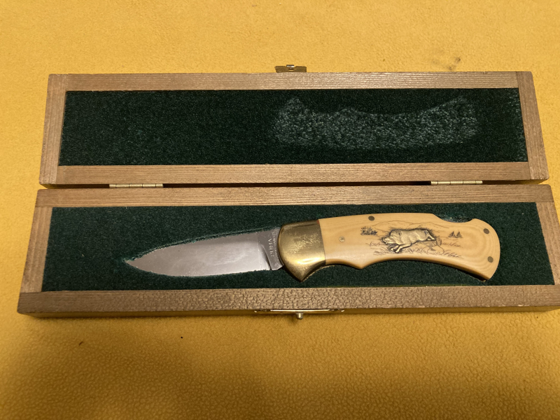 Hier versteigere / verkaufe ich ein ORIGINAL PUMA GERMANY STAINLESS aus der WILDLIFE SERIE NR: 307151 in der ORIGINAL Kiste. Es wurde am 01.05.1986 gekauft. Das Messer ist nicht benutzt worden ( Sammlerstück ), die Klinge ist einwandfrei, die Griffschalen sind auf Grund des Alters ( 39 Jahre ) etwas dunkler geworden ( siehe Bilder ). Die Griffschalen sind bemalt mit Tannen, Gräser, Berge und Sträucher. Auf der linken Seite ist ein flüchtender Keiler und rechts ein flüchtender Rehbock - in die Griffschalen eingearbeitet / eingelassen ( Gold ). Privatverkauf nur an Berechtigte mit Altersnachweis. Versand innerhalb Deutschland.