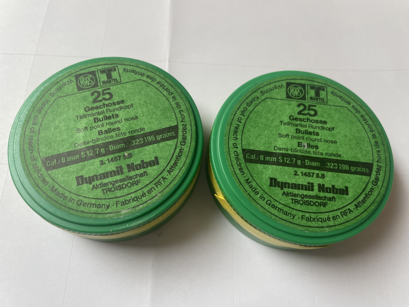Zum Verkauf aus Nachlass: 50 × Dynamit Nobel – Kaliber 8 mm S (Ø .323 / 196 gr / 12,7 g). Originalverpackt, siehe Foto. Versand oder Abholung nach Vereinbarung. Privatverkauf — keine Rücknahme.