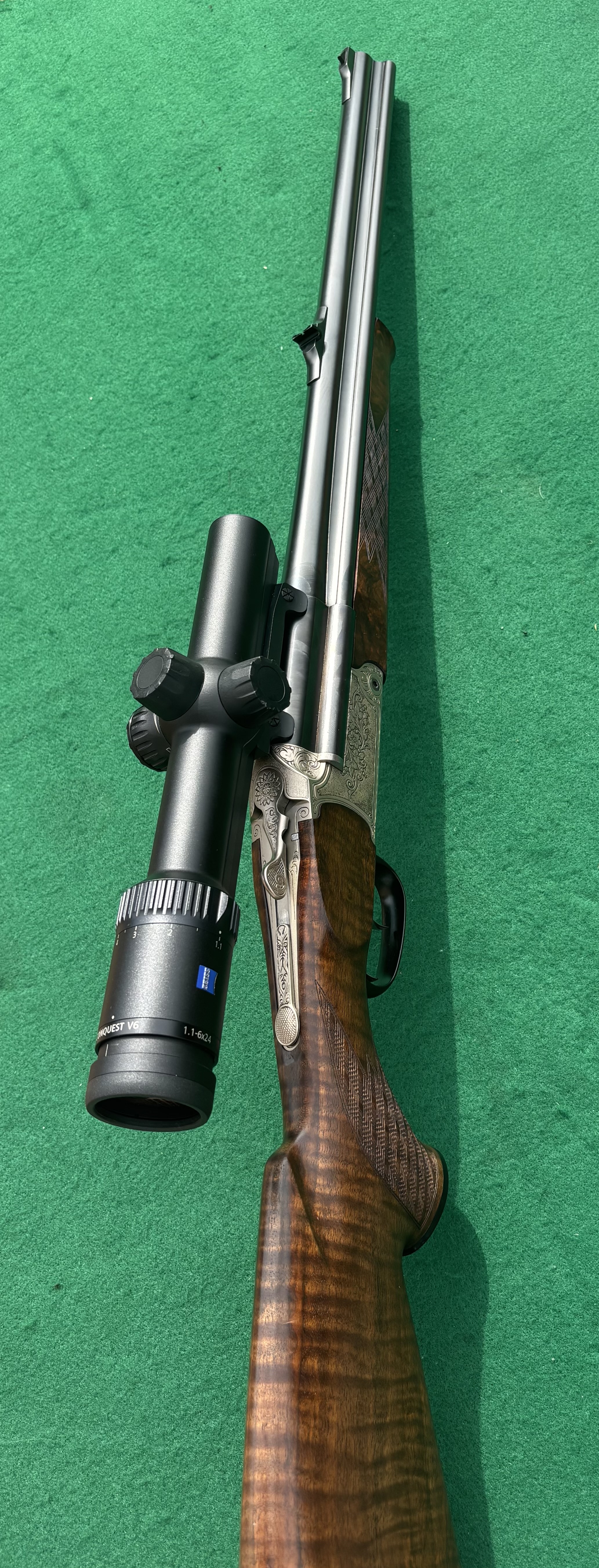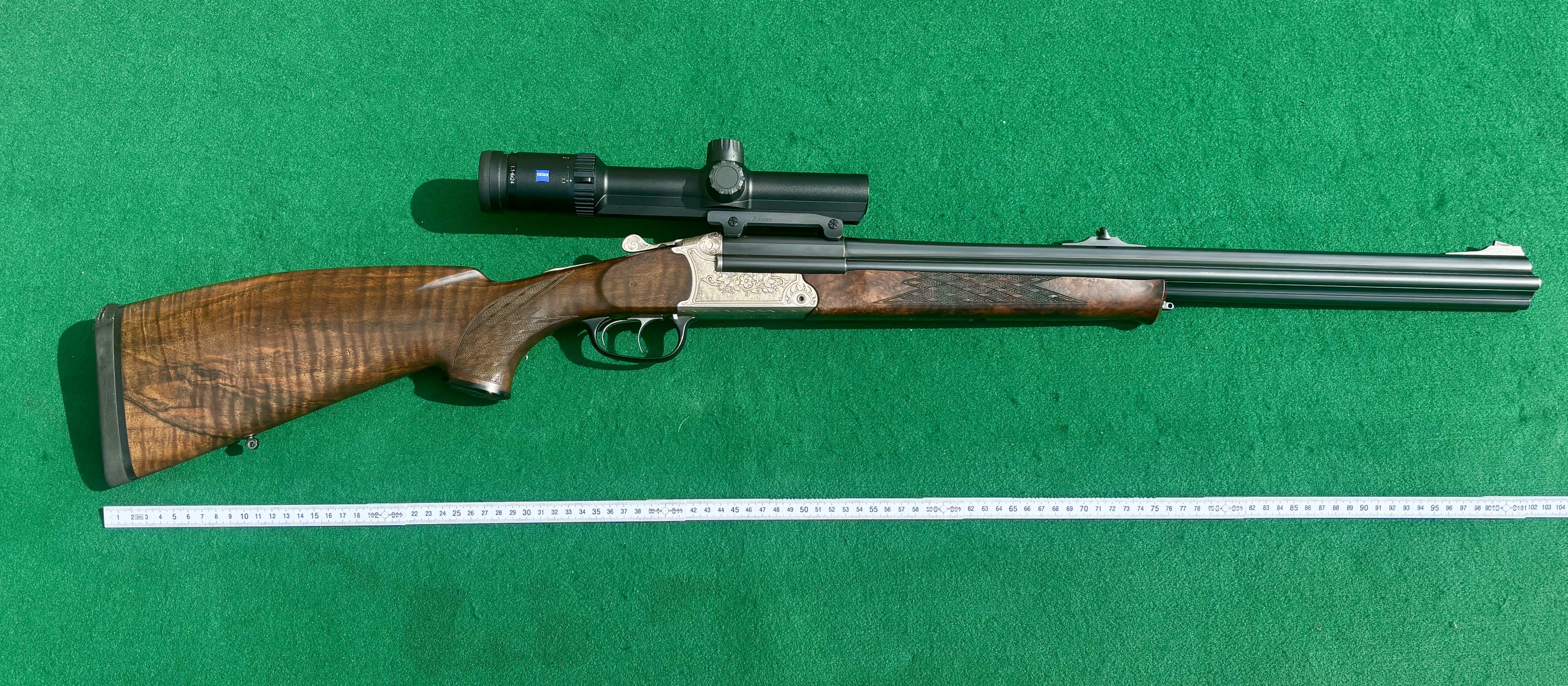 Zum Verkauf steht ein handgefertigter Doppelbüchsdrilling ATL „Prinz“, aufgebaut auf einer Blaser/Sauer-Bockbüchsflintenbasis (BBF). Die Kaliberkombination 12/76 – 8×57 IRS – 5,6×50 R Mag macht diese Waffe zu einer besonders vielseitigen und jagdpraktischen Kombination – ideal für Hoch- und Niederwild sowie für den kombinierten Einsatz auf der Pirsch oder im Ansitz.