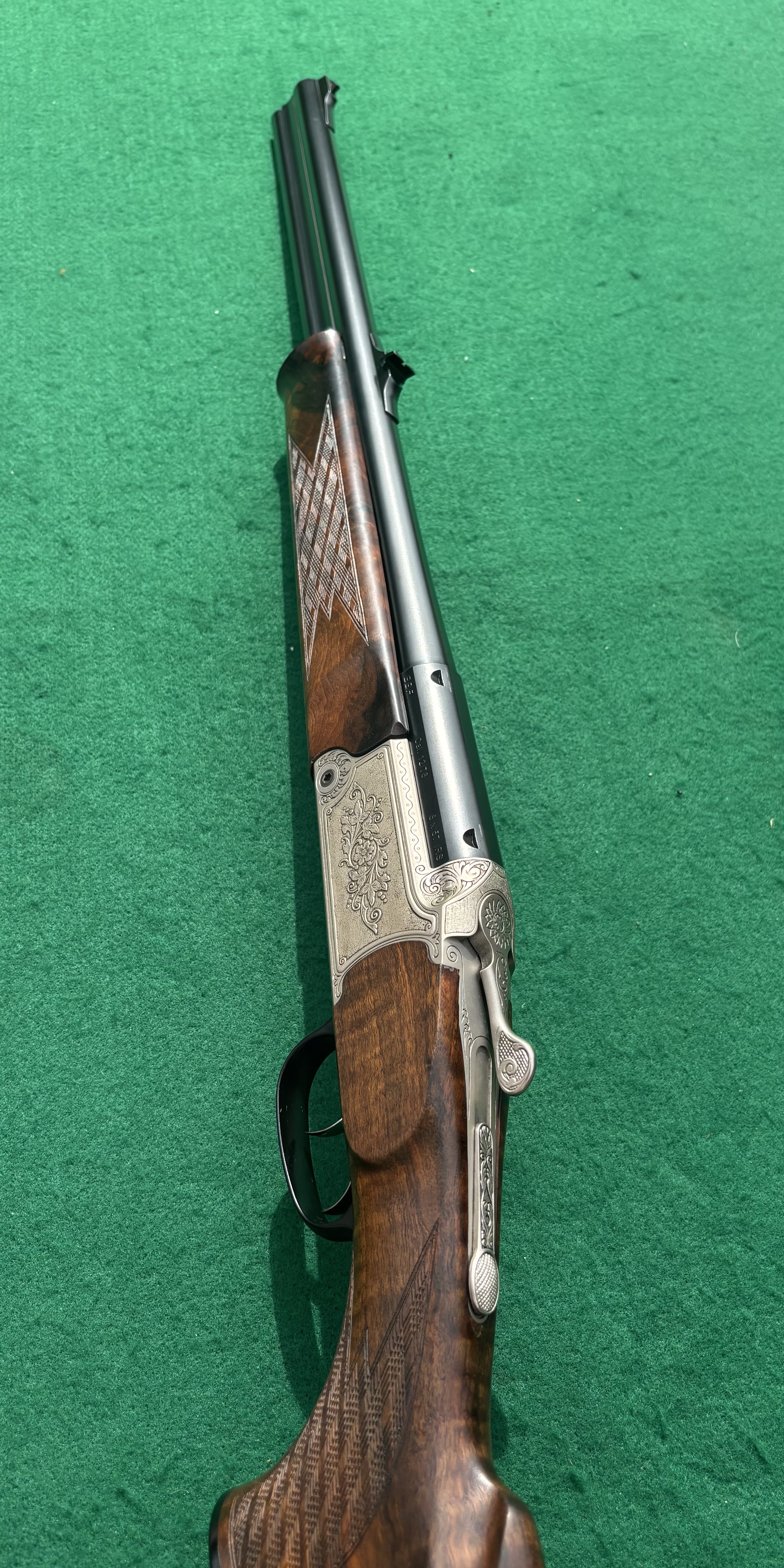Diese Bockbüchsflinte wurde von der Waffenmanufaktur Prinz (Maierhöfen, Deutschland, https://prinz-waffen.de/galerie/) mit einem zweiten Kugellauf ausgestattet und veredelt. Sie vereint zuverlässige Systemtechnik von Blaser/Sauer mit handwerklicher Präzision und klassischem Stil. Die Gravuren, die Schäftung sowie die feine Abstimmung der Mechanik verleihen der Waffe echten Unikat-Charakter.