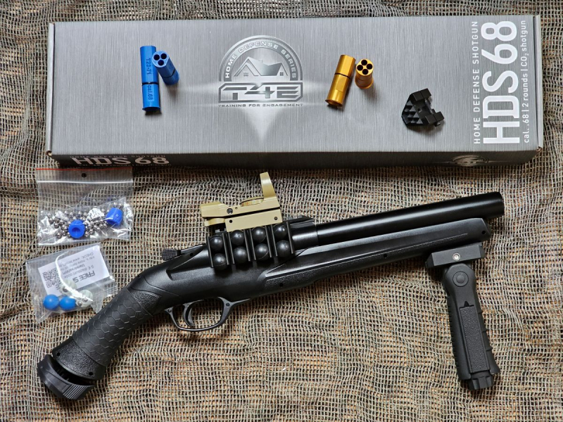Verkleinere meine Sammlung. Hier: Umarex HDS 68 ("Home Defence Shotgun") aus der T4E Reihe ("Training for Engagement"). Modellnummer: IN 50776. Aus erster Hand. Ausstellungs-/Sammlerwaffe, top Zustand und voll funktionsfähig. Wenig geschossen. Mit einigen Anbauteilen etwas aufgewertet: Oberschiene ersetzt durch eine Rail-/Kugelhalter-Kombination (original Abdeckung dabei). Handgriff Bodenstück (Darin sitzt die Bodenschraube (Bereitschaftsmodus, Schlagaktivierung ist damit weiter gegeben). Mehrpositionen Frontgriff vorne. Red Dot Visier (verschiedene Visierbilder: Kreuz, Ring, Punkt oder ähnlich Eotech). Handstop "Glasbreaker". 2 Paar Cal 68 Hülsen für 6mm BB's dabei (Bei deren Verwendung muss allerdings die Picattiny Schiene abgenommen werden). Dichtungen der Co2 Kapsel und der Griffschraube immer Silikongepflegt. Original Karton mit Anleitung und Inbusschlüssel. Die abgebildeten Einzelgeschosse sind dabei und ich lege noch schwarze und blaue Rubberballs sowie einige CO2 Kartuschen dazu, damit der Käufer gleich starten kann.