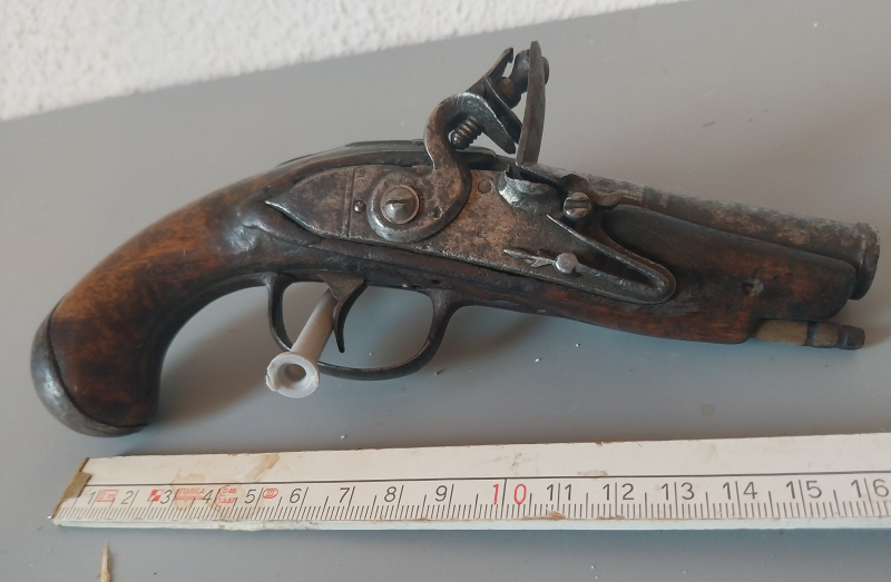 Aus Nachlass Reisepistole Steinschloss, Die Waffe lässt sich spannen und abschlagen Zustand siehe Fotoserie