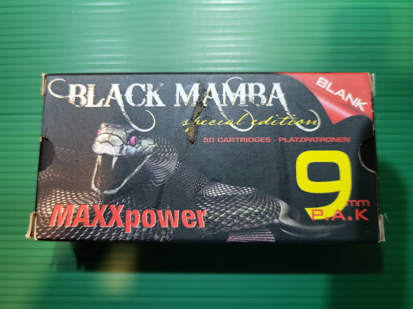 Sie bieten auf 50 Knallpatronen Black Mamba Special Ededion im Cal. 9mm für Pistolen.