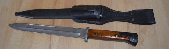 Verkauft werden soll ein Seitengewehr/Bajonett 84/98.Hersteller ist C.G. Haenel Suhl.Auf Klingenrücken Preußische Abnahme-unter Krone W 87.Auf der Parierstange Truppenstempel R.R.1.Griffschahlen überarbeitet und Klarlack behandelt.Drücker durch den Lack fest.Auf der rechten Klingenseite einige kleine Fehlstellen im Metall.Lederscheide in guten Zustand-nicht geschrumpft nach langer Zeit,Koppelschuh nicht brüchig mit Stempel Steinmetz.Auf jeden Fall ein Sammelwürdiges Objekt.Ich verkaufe ohne Garantie,ohne Gewehrleistung,ohne Rücknahme.Bieter aus dem Ausland Versandkosten erfragen.