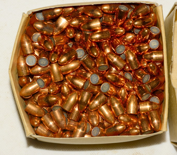 500 Kupfer-Vollmantelgeschosse cal. 9mm Para, Geschosslänge 15,6 mm, Gewicht 8,18 Gramm, der Kartondeckel an einer Kante eingerissen