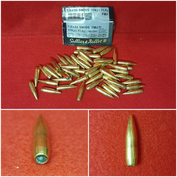 Zum Verkauf kommen 400 Geschosse im Kaliber 7,5x55 / 307 - 308 FMJ. Die Hülsen sind noch nicht abgeschossen. Die Geschosse gibt es nicht von S&B zu kaufen, vermutlich auch keine S&B Produktion sondern ein Zukauf von hochwertigern Match Geschossen Die Hülsen stammen aus feucht gewordenen Patronen. Die Geschosse wurden mit der Spannzange gezogen, entzündet ( nicht kalibriert ) und die Hülse gereinigt. Für Fragen stehe ich gerne zur Verfügung.