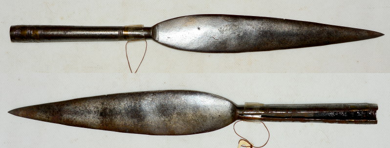 Original afrikanische Speerspitze, 20 cm lange Klinge mit 12 cm Tülle, maximale Klingenbreite 34 mm, guter Zustand mit Alterspatina