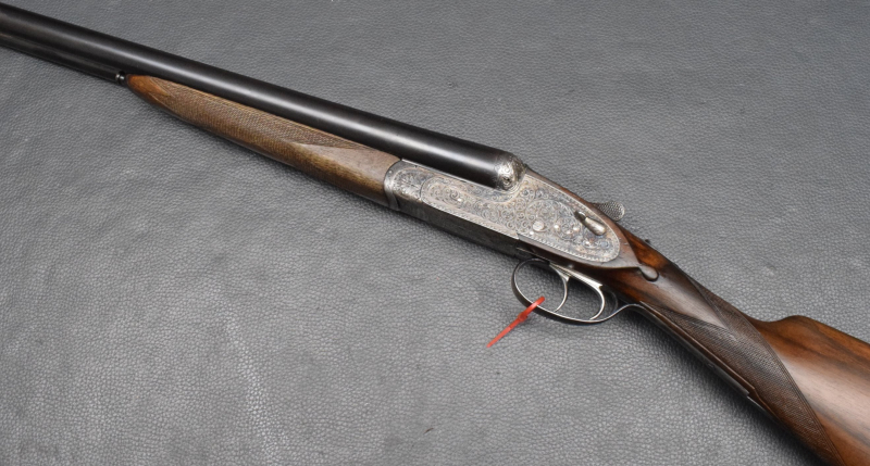 Messingkorn, Stahlbasküle mit Arabeskengravur, Seitenschlosse, Lauf mit Ejektoren, Sicherungschieber auf dem Kolbenhals,
