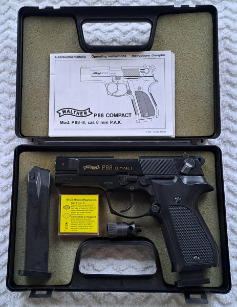 +++ Hersteller: Walther-in-Lizenz-Nachbau durch Umarex / Kaliber: 8 mm / Munition: Gas- und Platzpatronen / Kapazität: Magazin für 16 Patronen plus 1 Patrone im Lauf / Gewicht: ca. 1 kg / Laufsperre: Ab der Mündung einwärts nach ca. 10 mm, von außen kaum sichtbar / Alter: Unbekannt; vermutlich sehr alt. / Stempelungen: Linke Seite: Walther P88 COMPACT; Bundesadler; Wappen; KD / Rechte Seite: Name und Design unter Lizenz der Carl Walther GmbH.; Mod. P88-8; cal. 8mmK.; Made in Germany; PTB 428 / Oberfläche: Brüniert; schwarz- bis braun-glänzend / Beschusstest: Keiner / Trockentest: Patronen werden problemlos eingeschoben und ausgeworfen; Single- und Doubleaction funktionieren; Schlagbolzen beweglich; Schlitten beweglich; alle weiteren Teile auch beweglich; alles rastet gut ein und aus; keine Fehlfunktionen; augenscheinlich voll funktionsfähig / Zustand: Keine Katscher; keine Kratzer; kein Abrieb; sieht wie neu aus; guter bis sehr guter gebrauchter Zustand. / Lieferumfang: Kunststoff-Koffer; Pistole; Magazin; Ersatzmagazin; Schießbecher; Gebrauchsanweisung, 10 sehr alte Gaspatronen / Hinweise: Zur Selbstverteidigung für unterwegs zwar geeignet aber unpraktisch weil zu groß und zu schwer; für zuhause eher tauglich (aber: Gaspatronen zuhause abfeuern ist eine schlechte Empfehlung); allerdings ist dieses Exemplar als Selbstverteidigungs- und Sylvesterwaffe zu schade weil neuwertig; daher eher Sammlerstück für Liebhaber der ersten PTB-Nummer; hier noch mit goldenem Schriftzug und im Kaliber 8 mm d.h. mit großer Magazinkapazität; ansonsten: Wuchtiger Hingucker in der Vitrine. / Verkauf und Versand: Nur Deutschland; keine Inseln. +++