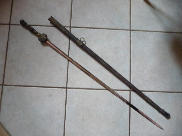 Gefäß gealtert, also angelaufen. Der Bügel ist weg gemacht worden. Messingbeschläge und Klinge sind gut, Hersteller Weyersberg.