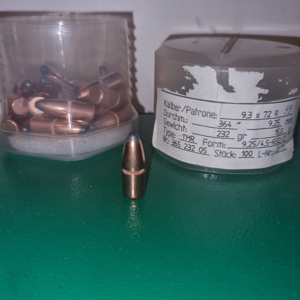 Angeboten werden nicht mehr benötigte Geschosse von Peter Delsing speziell für 9,3x72. Es handelt sich um 30 Teilmantel Geschosse mit 15 g Geschossgewicht in der Originalbox. Zuzüglich können 40 von Samereier geladene fertige Patronen bei Interesse gegen Erwerbsberechtigungsnachweis erworben werden. Preis / Patrone 4,00 €/Stck