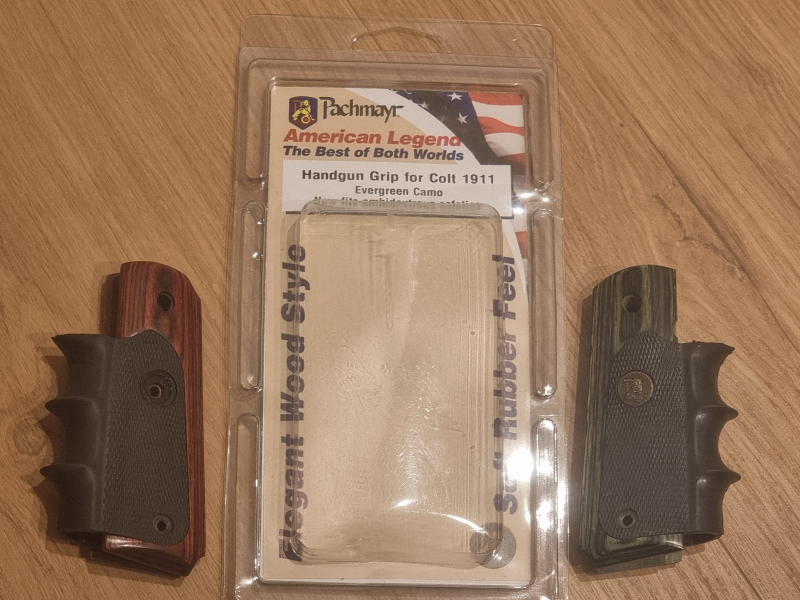 ich verkaufe hier meine Griffschalen der Marke Pachmayr für die Pistole 1911. Gegenstand dieser Auktion sind "2" Griffschalen von Pachmayr. Einmal die Ausführung in elegantem rot und einmal die Ausführung in grün. Beide Holzschalen sind, wie auf den Bildern zu sehen, in sehr gutem Zustand. Leider stehen für beide Geiffschalen nur einmal die Einsätze mit dem Pachmayr Emblem zur Verfügung.