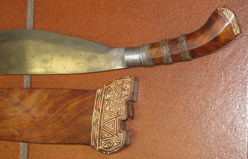 Ein schweres wuchtiges und scharfes Messer mit Holzscheide