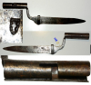 Frühes Tüllenbajonett aus der Mitte des 18. Jahrhunderts, große Messerklinge mit 23.2 cm Länge und an der Wurzel 4 cm Breite, Innendurchmesser der Tülle 25 mm, die Tülle ist mit 11,5 cm recht lang, Arretierschlitz 4 mm breit und für eine Kornlänge von 7,5 mm, oben mit Schlitz, was wohl eine Klemmwirkung hatte, hatte keinen Feststellring, also eine frühe Ausführung, auf der Klinge eine Schmiedemarke, Alters- und Gebrauchsspuren.