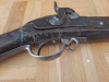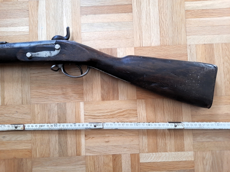 Vermutlich Preußisches Infanteriegewehr 1838 inkl. Bajonett. Länge ohne Bajonett ca. 133 cm. Schaftbreite ca. 6 cm. Schafthöhe ca. 23,5 cm. Zustand siehe Fotos. Schaft gebrochen und geklebt, verkratzt und mit Holzausbrüchen. Löcher von nicht aktivem Holzwurm. Metallteile geputzt. Schrauben teilweise nachträglich ersetzt. Ladestock nicht original. Abzugsmechanismus funktionierend. Inkl. Dillonbajonett siehe Fotos. Original-Vorderlader, kein Nachbau. Leider liegen mir keine weiteren Informationen zum Artikel vor.