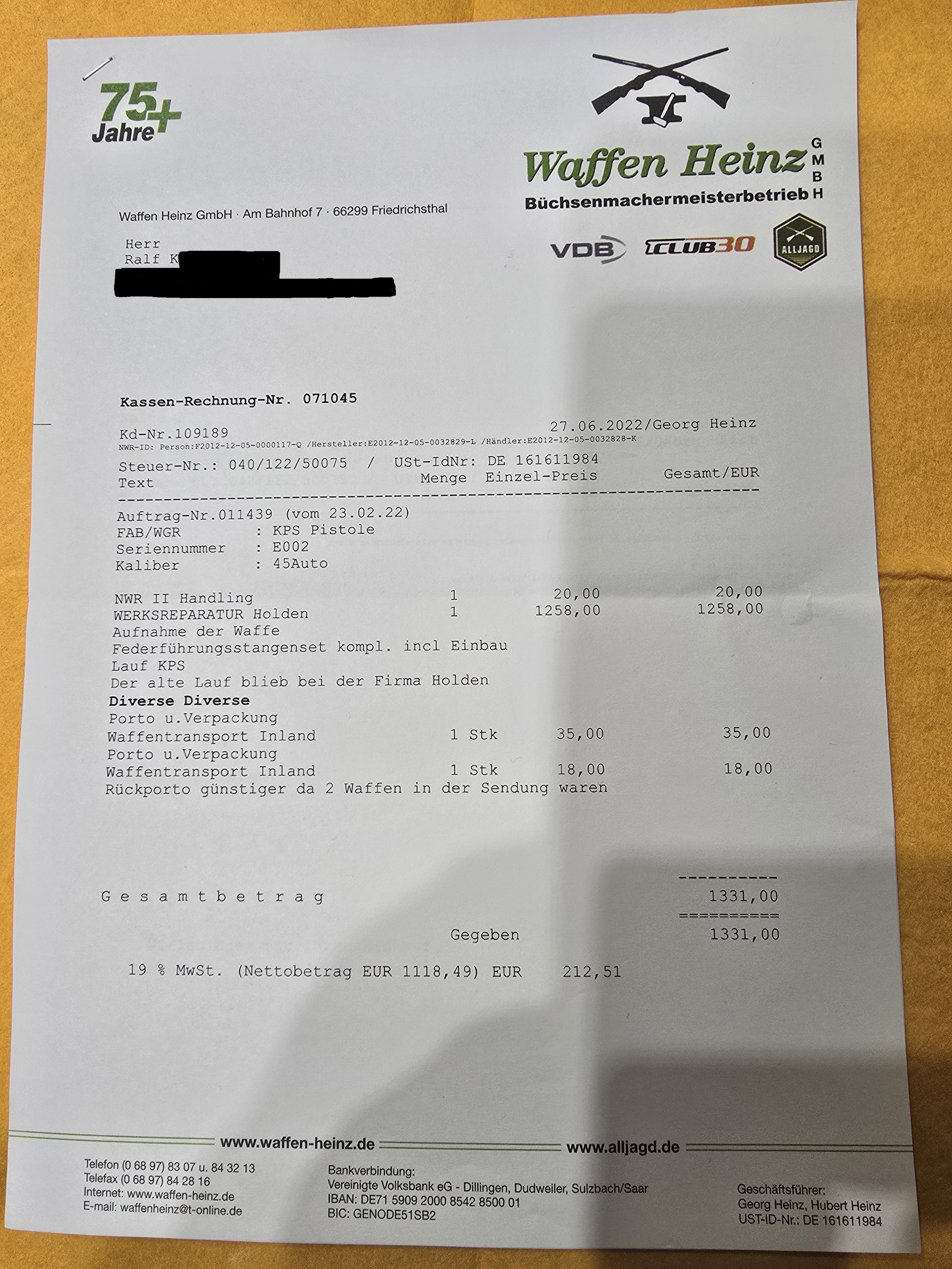 Ich habe die Waffe damals von einem Mitglied des damaligen Werksteams von KPS erworben und anschließend damit einige Jahre erfolgreich geschossen und auch zahlreiche Erfolge erzielt. Danach ist sie, als ich mich auf andere Disziplinen konzentriert habe, für viele Jahre in den Schrank gewandert. Als ich dann vor ein paar Jahren noch mal überredet wurde in dieser Disziplin anzutreten ist mir leider die Federführungsstange gebrochen und dabei wurde auch der Lauf beschädigt. Bei der darauf hin erfolgten Reparatur 2022 wurde dann eine neue Federführungsstange und auch ein neuer Lauf eingebaut (siehe Rechnung, 1330 Euro). Danach wurden lediglich noch ca. 100 Schuss aus der Waffe geschossen da ich mich wieder auf andere Disziplinen verlegt habe. Das heißt die Sie erwerben eine Waffe mit neuwertigen fast ungeschlossenen Lauf.