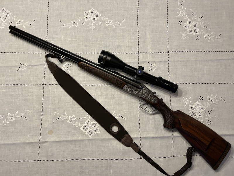 Zum Verkauf steht ein sehr schöner gebrauchter Drilling der Firma Heym mit Seitenschlosse und tief gestochenen Tier Stück Gravuren vom Graveur M. Fleischer, siehe Signatur. Die Kaliber sind .30-06 und 2x 12/70 die Läufe schießen zusammen.