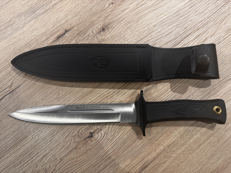 Verkaufe Muela Scorpion 19W Messer. 19 cm Klinge aus rostfreiem Stahl, satiniert und mit Beschichtung. Schwarzer Kunststoffgriff. Mit dazugehöriger Messerscheide.