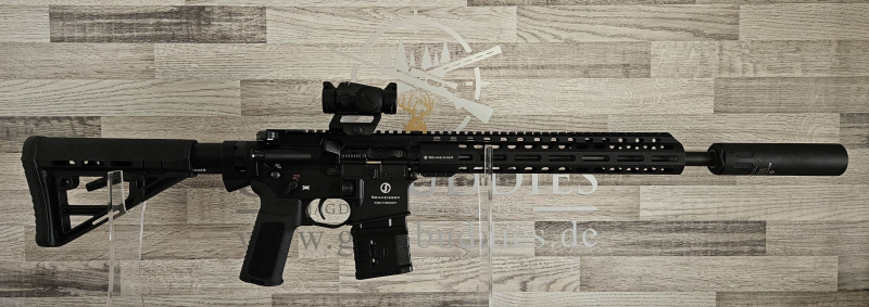 Als Komplettset einsatzfertig montiert mit Reflexvisier / Red-Dot-Sight FALKE S und Schalldämpfer Schmeisser SD15.