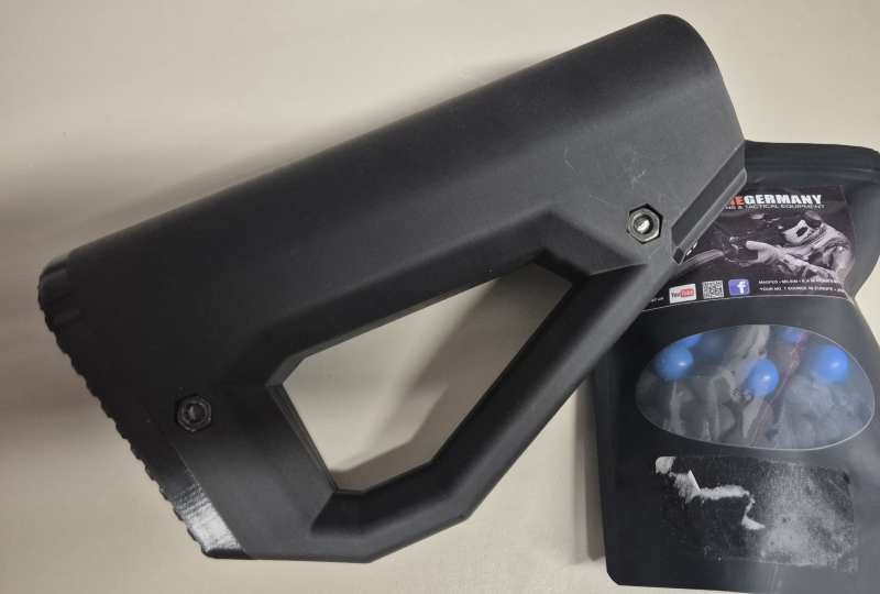 HD24 Hinterschaft/ Schulterstütze für AEA Megalodon, schwarz, mit Öffnung zum Ablesen des Tankmanometers (sofern verbaut!), dazu gibt es 100 passende .50 Rubberballs T4E und Ultra High Speed (85xT4E Rub 50+