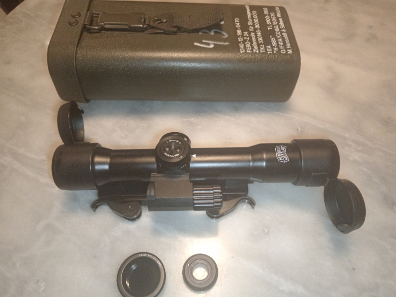 Lieferumfang: das Zielfernrohr, Beleuchtungseinheit, Höheneinstellungsräder in .223 und .308, IEA Montage für Picatinny-Weaver Schiene, Sonnenblende, Bundeswehrtransportbox. Schraube für den Höhenanschlag liegt bei.