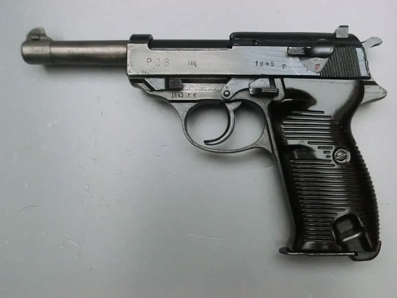 Altersbedingt wird aus dem Bestand eines Schützenkollegen eine nummerngleiche Wehrmachtspistole P38, aus Spreewerkefertigung Code „cyq“ mit der Seriennummer „1845r“ angeboten. Die Waffe hat die letzten Jahrzehnte im Schrank gut versorgt gelagert und wurde nicht geschossen. Die Seriennummer ist ordnungsgemäß auf Griff, Verschluss und Lauf gestempelt. Wehrmachtsabnahmestempel „Adler über 35“ befinden sich auf Verschluss rechts, Griff links, Lauf und Riegel. Die P38 hat keinen Neubeschuss.