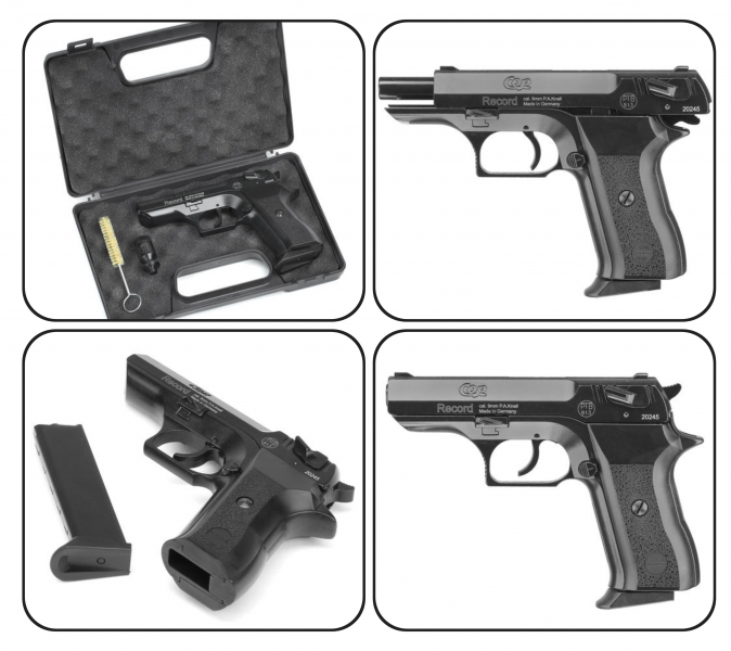 Der Lauf der Record 2015 Schreckschusspistole lädt sich nach jedem Schuss selbstständig mit einer neuen Patrone. Die Pistole besitzt eine Schlagstücksicherung, einen Stahlstoßboden und einen außenliegenden Schlaghahn mit Single- und Double-Action Abzug. Durch die leicht aufgerauten Kunststoffgriffschalen und die geringe Größe der Waffe von nur 15,8cm liegt sie sehr gut in der Hand und ist leicht zu transportieren. (Zum Führen der Waffe wird ein kleiner Waffenschein benötigt)