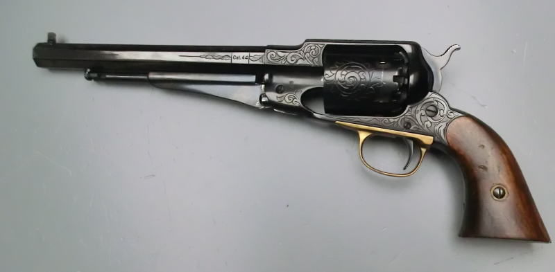 Aus dem Bestand eines Alt-Schützen wird ein Perkussionsrevolver New Model Army im Kal. 44 aus Santa Barbara-Fertigung angeboten. Die Waffe hat einen spiegelblanken Matchlauf. Der Abzug löst direkt und trocken aus. Die Waffe ist modellmäßig graviert. Sie hat die üblichen Gebrauchsspuren einer umsichtig gepflegten Matchwaffe.